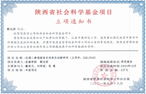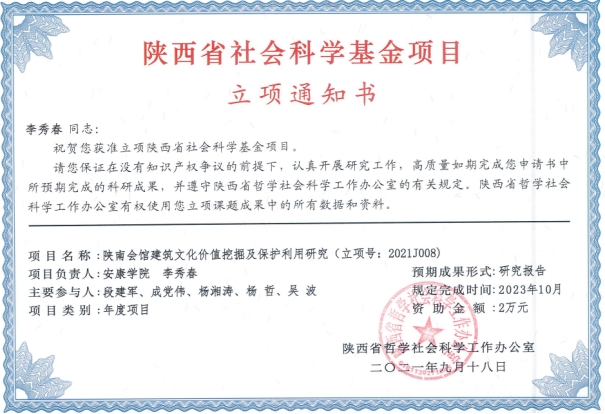 近日,陕西省哲学社会科学工作办公室公布了2021年度陕西省社科基金年度项目立项结果,公司青年教师鄢志莉、李秀春申报的项目获批立项。