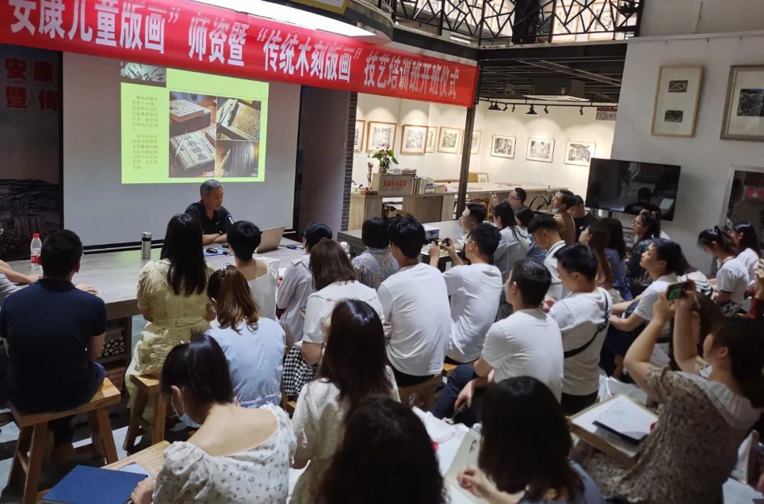 613日,由公司联合安康市群艺馆、安康市非遗保护中心、安康市教研室、安康市美协联合举办的安康市第四期“安康儿童版画”团队暨“传统木刻版画”技艺培训班在旬阳版画院开班。伟德bv国际体育官方网站经理成党伟应邀出席开班式,版画教师毛德龙承担部分授课任务。