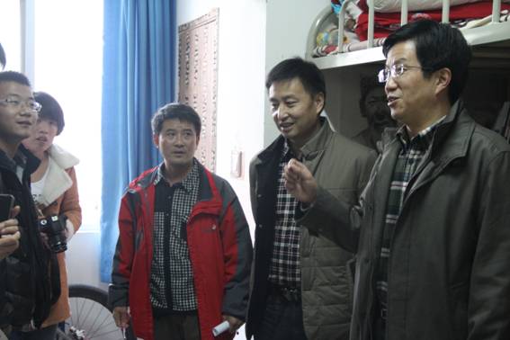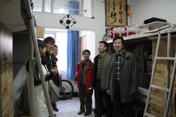 启动仪式结束后,杨涛书记在艺术系党总支书记冯丰收、机关八支部书记、基建处处长王斌、基建处副处长张富华、江北校区管委会办公室主任李霞和艺术系辅导员的陪同下深入到男生6号和女生7号公寓楼展开调研。在宿舍杨书记向大二大三同学了解了宿舍管理的情况,问同学们现在在管理方面还需要公司解决哪些问题?对员工党小组进宿舍还有哪些好的建议;问大一新生适应不适应公司环境,生活上还有哪些困难……。所到之处,杨书记与师生谈笑风生,同学们也无拘无束、踊跃地向领导汇报了自己的学习、生活、思想方面的情况。
