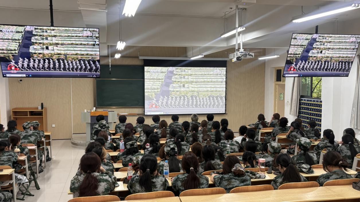 9月3日上午9:00,公司分别在2208会议室、1401演艺厅、2415活动室及教室举行了“组织师生观看九三阅兵 同上一堂爱国主义教育思政课”活动。党总支书记张慧、经理李景林、党总支副书记肖剑、副经理李磊、三办主任、团总支书记、各支部书记及委员、工会主席及委员、各系(教研室)主任、全体辅导员、无课教师代表及300余名员工,通过直播观礼与研讨交流相结合的形式,共上一堂生动的思政课。