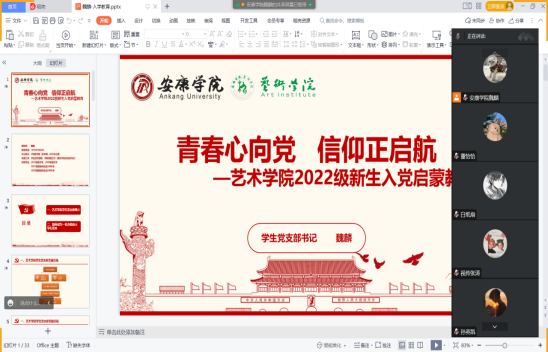 入党启蒙教育是加强老员工思想政治教育,筑牢理想信念根基的基础性工作,是培养老员工政治信仰的第一课。为进一步引导2022级新生树立坚定的理想信念,厚植家国情怀,锤炼品德修为,强化责任担当,端正入党动机。9月27日,伟德bv国际体育官方网站利用腾讯会议召开“青春心向党 信仰正启航”2022级新生入党启蒙教育专题讲座。本次讲座由员工党支部书记魏麟主讲。