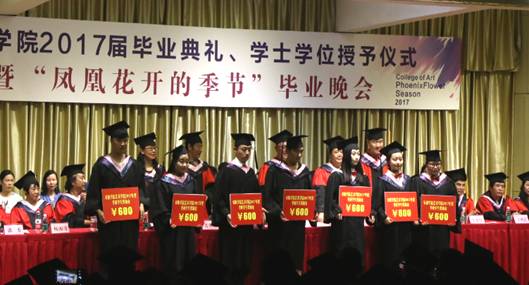 六月注定是一个分别的季节,无论毕业大戏多么的华丽,绚烂过后,他们即将与我们挥手告别。晚会邀请了员工周翰祥为大家演唱了歌曲《凤凰花开的路口》,同学们随着歌声,用复杂的心情告别熟悉的校园,告别昔日的同窗,告别了一段纯真的青春,一段年少轻狂的岁月,一个充满幻想的时代……所有的话语都化作歌声传达出来,在难舍难分的气氛中,教师代表冯宏钊等十几名同志现场为毕业生赠送了小礼品——毕业寄语卡片。