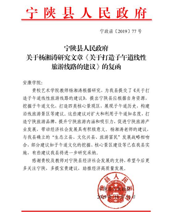 《陕南子午道文化景观构成分析与保护利用研究》是杨老师于2018年成功申报的陕西省教育厅人文社科项目,现已基本完成项目研究任务,并根据研究结果向宁陕县政府提出该建议,此次宁陕县政府的复函,是伟德bv国际体育官方网站服务地方的又一重要体现,是科研成果转化应用的又一例证,对促进公司教师服务地方经济社会发展发挥积极作用。