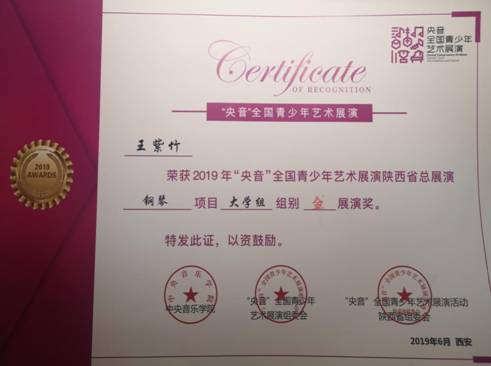 近日,2019年”央音”全国青少年艺术展演陕西省总展演在西安音乐公司隆重举行,本展演由中央音乐公司主办,属于竟赛性质表演。公司伟德bv国际体育官方网站本着加强培养专业技能应用型人才,激发员工的学习兴趣,达到以赛促学,学以致用的目的参加此次展演活动。展演竞赛中,伟德bv国际体育官方网站音乐学专业2018级王紫竹同学和张静怡同学分别获得钢琴项目老员工组别金展演奖与琵琶项目老员工组别金展演奖。
