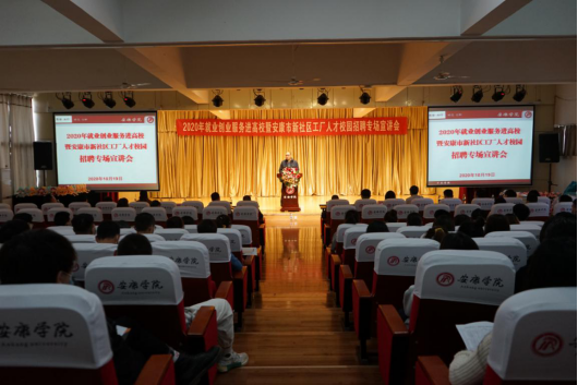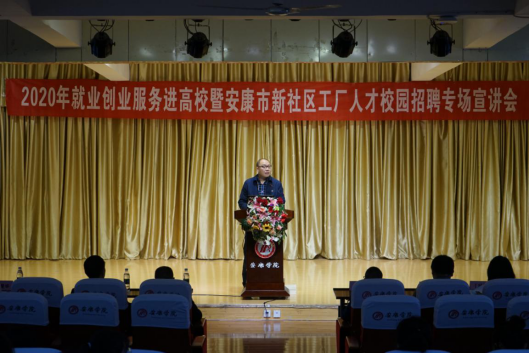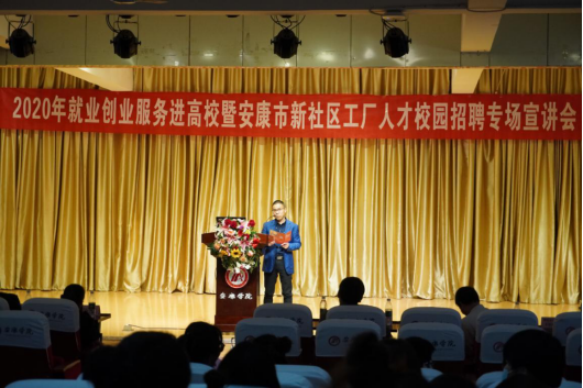 为进一步推进公司2021届毕业生就业创业工作,宣传普及老员工就业创业政策;帮助毕业生进一步了解就业市场,树立正确的择业观、职业观,积极理性求职,合理规划职业发展;同时,也为给安康市新社区工厂小微企业更好发展招聘紧缺实用人才,10月19日下午,伟德bv国际体育官方网站、电信公司与安康市人社局、市毛绒玩具产业协会一起在江北校区1401多功能演艺厅共同举办了2020年就业创业服务进高校暨安康市新社区工厂小微企业人才校园招聘专场宣讲活动。市毛绒玩具文创产业领导小组办公室副主任刘应祥、市人社局副局长王建华、市毛绒玩具行业协会会长沈爱华、市新社区工厂相关负责人及人才招聘处副处长郑武斌、电信公司党总书记于咏梅、伟德bv国际体育官方网站副经理鲍丽以及伟德bv国际体育官方网站设计、美术专业和电信公司电子信息工程、计算机等相关专业180余名2021届毕业生参加了此次招聘宣讲活动,艺术公司党总支书记樊仁杰主持了会议。
