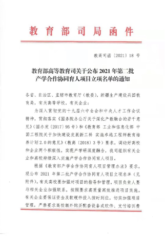 根据12月14日《教育部高等教育司关于公布2021年第二批产学合作协同育人项目立项名单的通知》,由公司吴波、成党伟老师分别申报的2个项目获批立项。