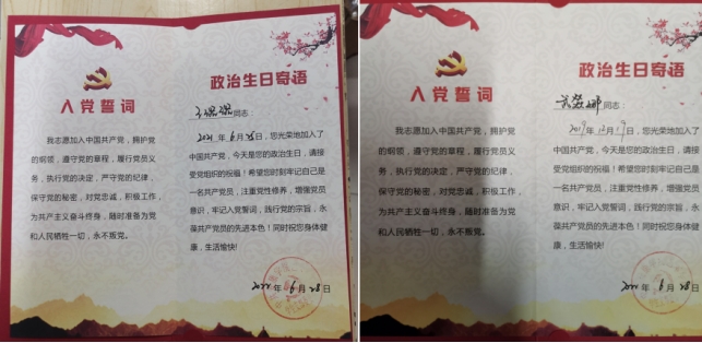 共过一次政治生日·分享一个入党故事。公司员工党支部为全体毕业生党员精心设计了党员政治生日纪念卡。毕业生党员代表曹丁太、惠洁婷分享了入党故事。通过共过政治生日、分享入党故事,使每名员工党员强化身份意识,坚定政治信仰,永葆政治本色。