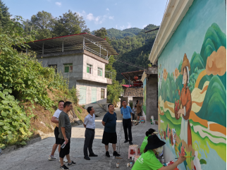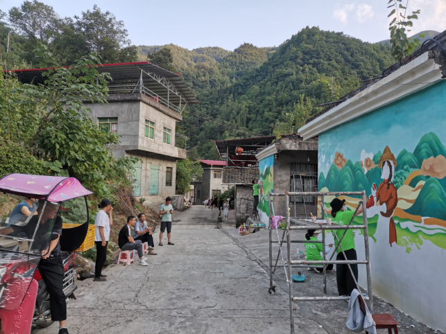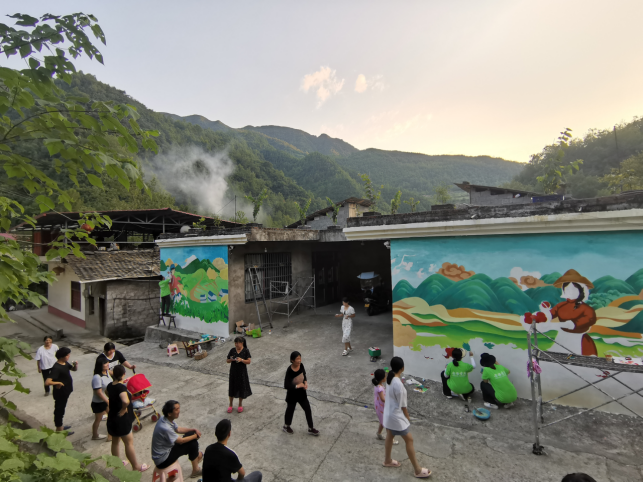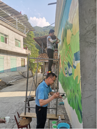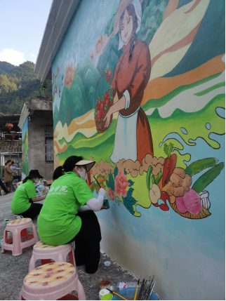 7月25—26日,院领导成党伟经理亲临现场指导,看到干劲十足的队员们,主动要求承担保障工作、接送队员、上色勾线。通过队员们的起早贪黑、顶着烈日的不懈努力,采茶图、丰收图和乡村振兴图终于大功告成,精美的画面、绚烂的色彩成为了村庄一道美丽的风景线,营造了文化氛围、提升了村庄风貌、激发了乡村活力,受到镇村领导和村民们的一致好评。