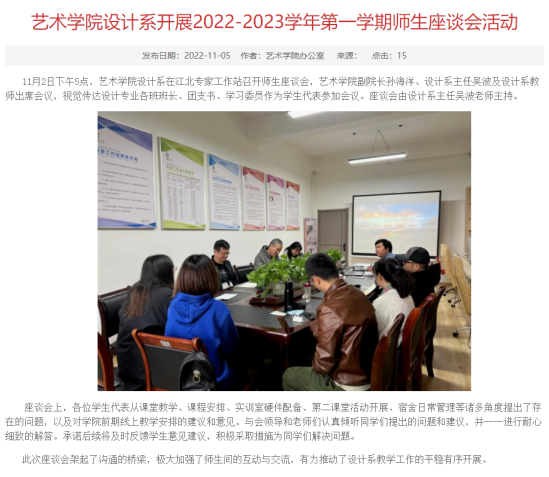 首先,伟德bv国际体育官方网站对日常教学巡查工作和院系领导督导听课情况进行了检查,由于受疫情影响,伟德bv国际体育官方网站课程80%都属于阶段性授课的理论实践课程,在教务处的大力协调下教学秩序井然,院系领导督导线上线下听课近20余次,教学效果良好。公司召开党政联席会议和教学工作会议学习了新一轮审核评估指标体系及相关政策文件学习,积极推进专业建设和专业认证工作,并对2022级人才培养方案进行了修订,对配套教学大纲进行了初步修订。美术学、视觉传达设计专业积极加大备课投入,全部使用新教案模板,在过程性材料搜集整理方面,全部使用新版非笔试考核材料考核方案。