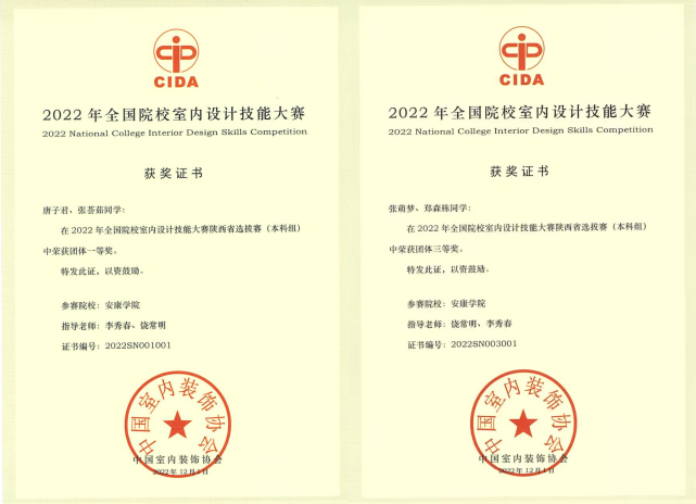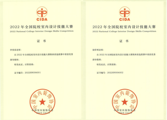 近日,2022年全国院校室内设计技能大赛(陕西赛区)比赛结果揭晓。由公司青年教师饶常明、李秀春指导的2020级视觉传达设计专业唐子君、张荟茹同学荣获本科组团体“一等奖”,并受邀参加国赛;2019级视觉传达设计专业张萌梦、郑森栋同学荣获本科组团体“三等奖”。饶常明、李秀春获本次大赛“优秀指导教师”。