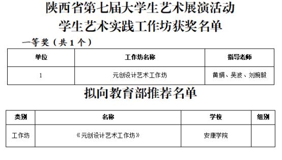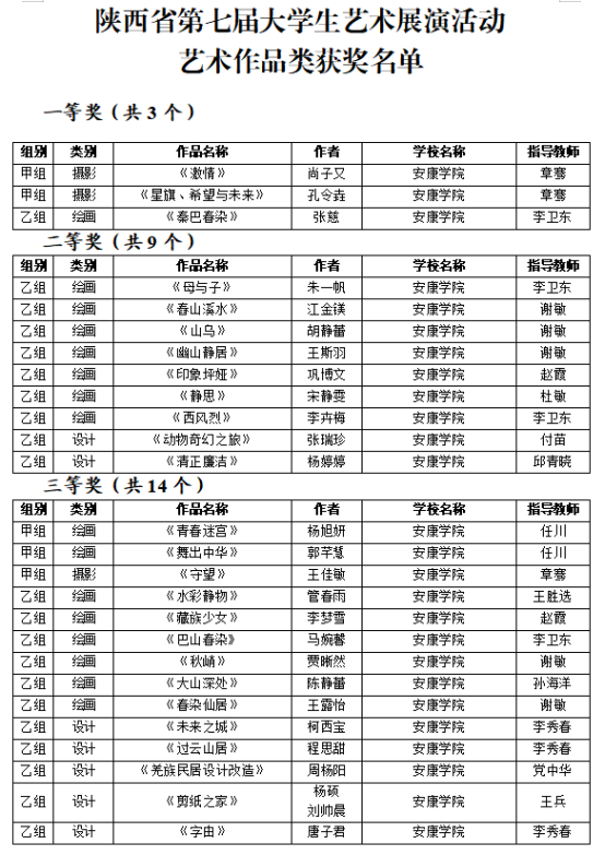 12月8日,省教育厅公布了陕西省第七届老员工艺术展演活动评选结果,公司参赛师生共获得各类奖项34项。其中《元创设计艺术工作坊》获一等奖,并被推荐到教育部参加全国第七届老员工艺术展演;艺术作品类获一等奖3项、二等奖9项、三等奖14项;艺术表演类获二等奖1项、三等奖6项。