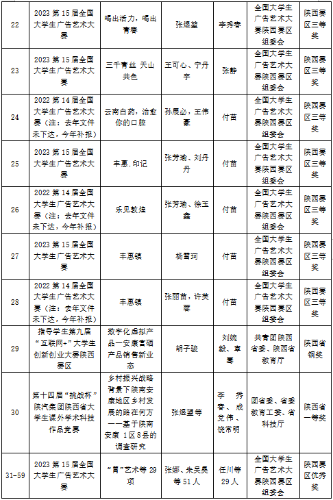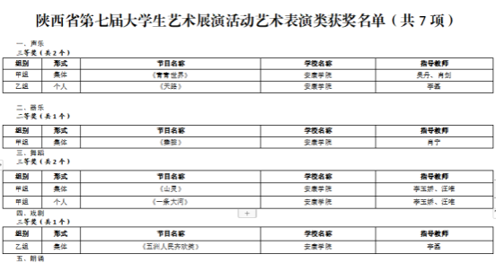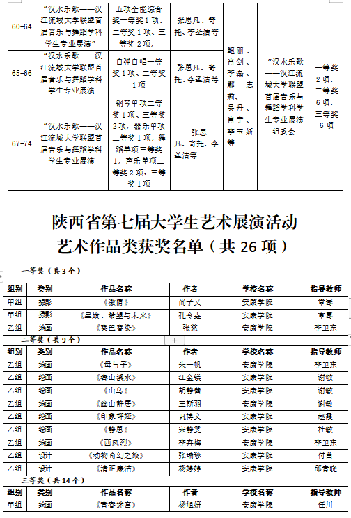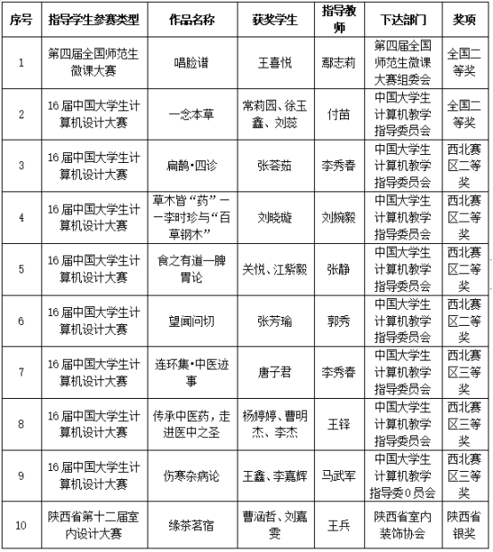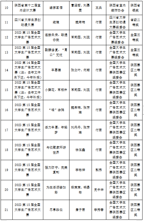 2023年,伟德bv国际体育官方网站学子在16届中国老员工计算机设计大赛、第15届全国老员工广告艺术大赛、第十四届“挑战杯”陕汽集团陕西省老员工课外学术科技作品竞赛、第九届“互联网+”老员工创新创业大赛、“汉水乐歌——汉江流域大学联盟首届音乐与舞蹈学科员工专业展演”活动等各类比赛中获得省级以上比赛奖项110项,其中国家级二等奖2项、三等奖2项,省级一等奖7项、二等奖31、三等奖38项、优秀奖29项。以赛促学、以赛促教、以赛促改,有效的促进了艺术类应用型人才培养。
