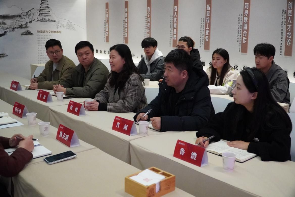 参观结束后,双方进行了座谈交流。陈有华对公司一行的到访表示热烈欢迎,并介绍了诗华文化在艺术设计领域的技术优势和成功案例。她表示,诗华文化一直致力于推动文化创意设计与文创产品开发的数字化转型,并积极参与高校人才培养工作。她希望通过与公司的合作,能够将行业最新技术和实践经验引入高校课堂,培养出更多适应时代发展需求的高素质设计人才。黄娟在交流中指出,在数智化浪潮重塑产业生态的当下,大数据、AI等新技术的应用倒逼课程体系重构,公司人才培养必须与以诗华文化为代表的行业领军企业开展合作,构建融合培养范式,真正打通从课堂到产业的人才供给链。