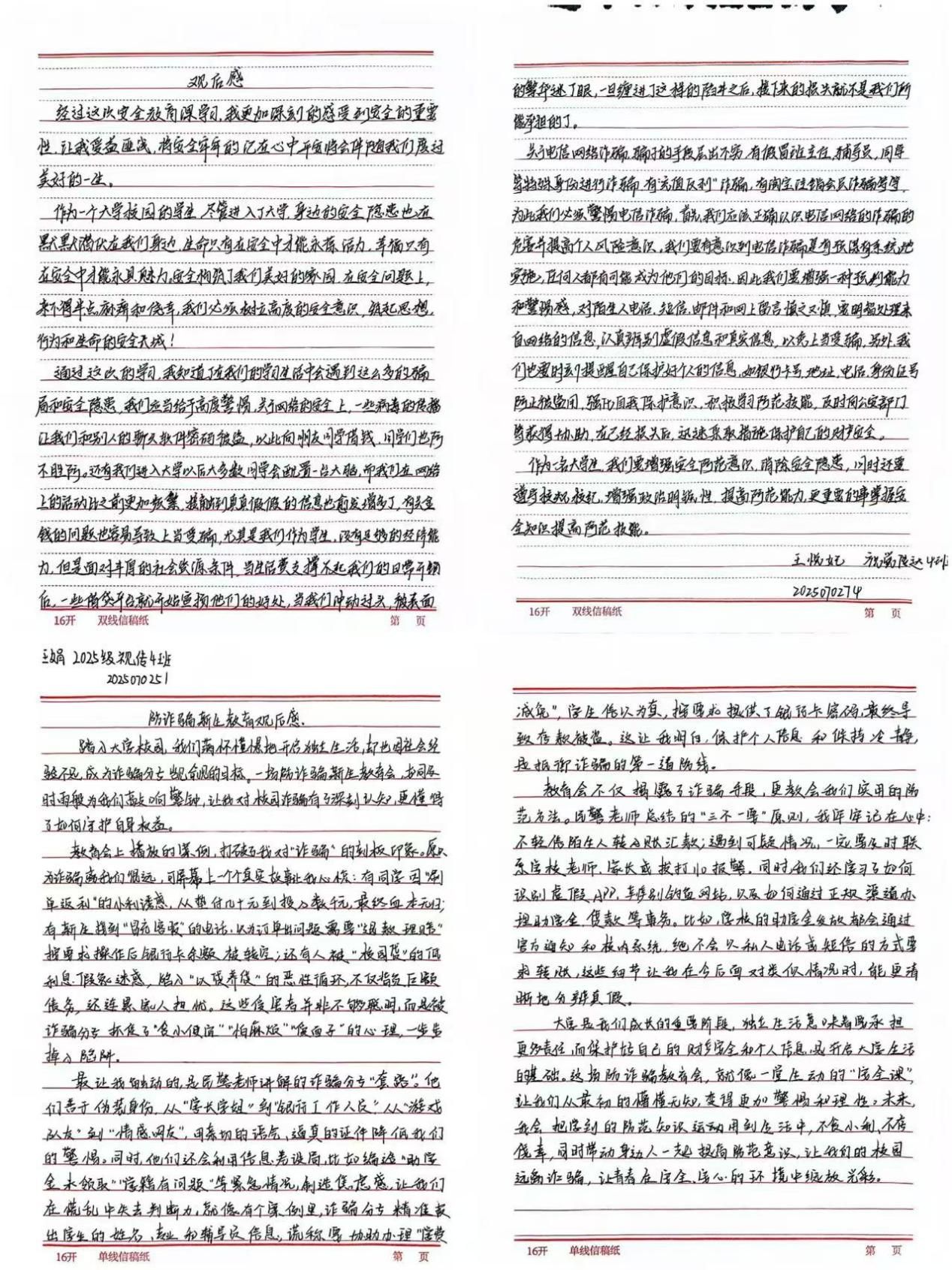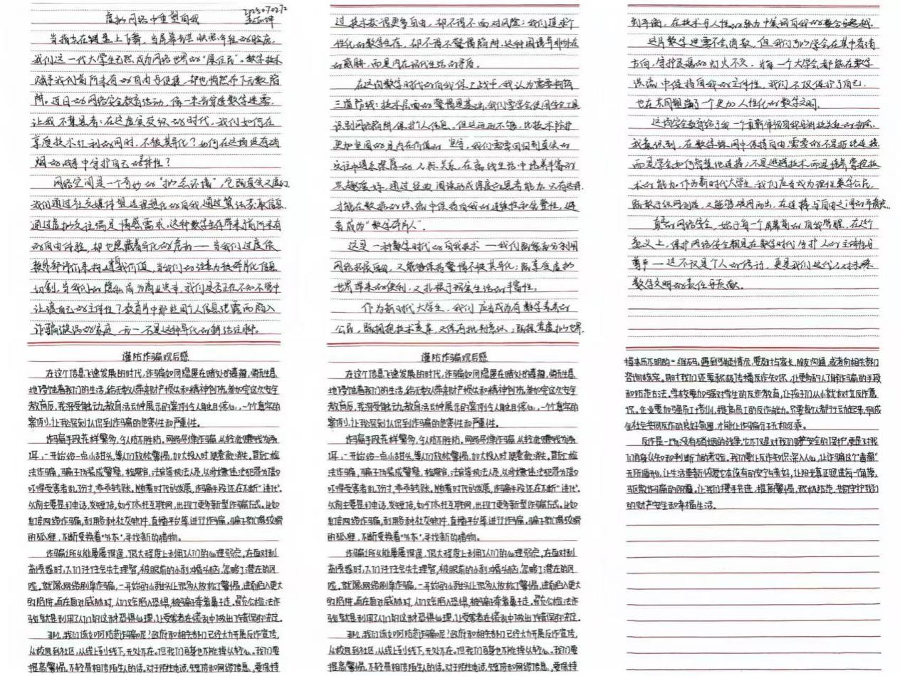 系列活动尾声,公司鼓励新生结合线上课堂所学与班会讲解内容,撰写个人心得体会。同学们在文中分享对电诈危害的新认知、防骗技巧的新掌握,字里行间满是参与活动的真实感悟,也标志着此次反诈教育真正入脑入心。