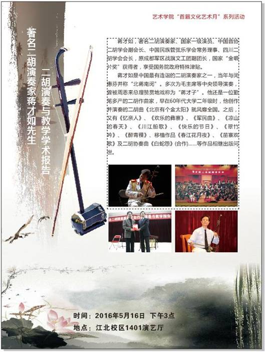 伟德bv国际体育官方网站“首届文化艺术月”——著名二胡演奏家蒋才如先生学术报告公告