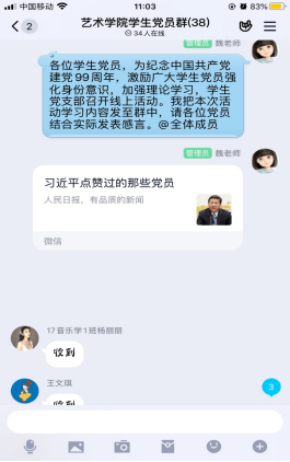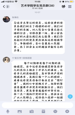 为庆祝中国共产党成立99周年,激励广老员工党员强化身份认同、加强理论学习,进一步坚定“四个自信”、“两个维护”。2020年6月30日上午,艺术公司员工党支部利用QQ线上平台,组织召开“学榜样,践初心”庆“七一”主题党日活动。本次活动由员工党支部书记魏麟主持,全体员工党员参加