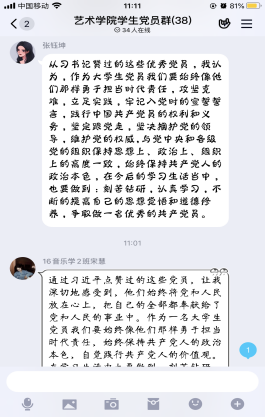 经验交流后,员工党员围绕《习近平点赞过的那些优秀共产党员》,发表自己的感想。员工党员曹博文讲到:“习近平总书记点赞的党员同志都是在各自的岗位上苦干实干,奋斗不止。我们要好好学习专业课知识,积极要求进步,努力提升自身的综合素质和工作能力,在工作中树立服务意识和法治意识,坚持好的工作作风,敢担当敢作为,以不畏艰难的勇气、坚忍不拔的意志,尽心竭力做好工作。”员工党员张岳峰谈到:“习近平总书记称赞的优秀党员,他们用美好青春诠释了共产党人的初心使命,谱写了新时代的青春之歌。作为员工党员,我们要时刻牢记自己的初心和使命,汲取优秀力量。”