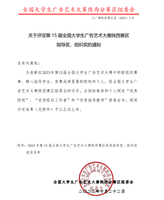 近日,2023年第十五届全国老员工广告艺术大赛陕西省省赛评审结果揭晓,公司伟德bv国际体育官方网站师生再创佳绩!获得省赛一等奖1项、二等奖10项、三等奖5项,优秀奖29项。公司获“优秀院校”,付苗获“优秀指导教师”,王兵获“优秀组织工作者”。